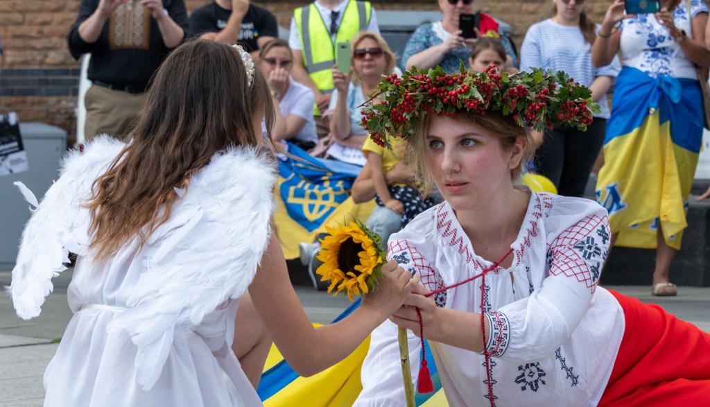 At Sneinton Market supporters gave messages of solidarity and Ukrainians spoke about their experiences, sang the State Anthem of Ukraine and staged a performance of a locally produced short play. The play showed a young lady who represented Ukraine with her children and possessions being stolen by people wearing the Russian ‘Z’ for invasion symbol. It represented the impact of war on Ukraine but at the same time showed the resolve of the Ukrainian people to overcome the invasion and the support from other countries around the world.